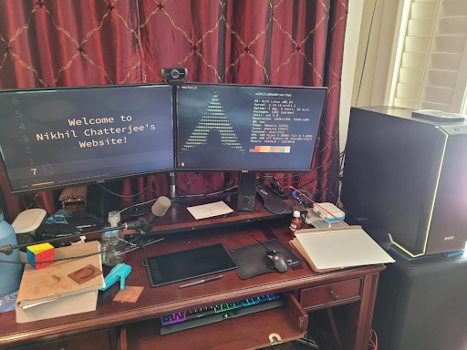 The pride of my life, the beauty that I return to every day, my computer. It may look messy, but it has a few special components: the actual desktop (on the far right), the two monitors, the mouse and keyboard, and the drawing tablet with pen. This is where I do all of my work throughout the day, using arch linux and other free applications.